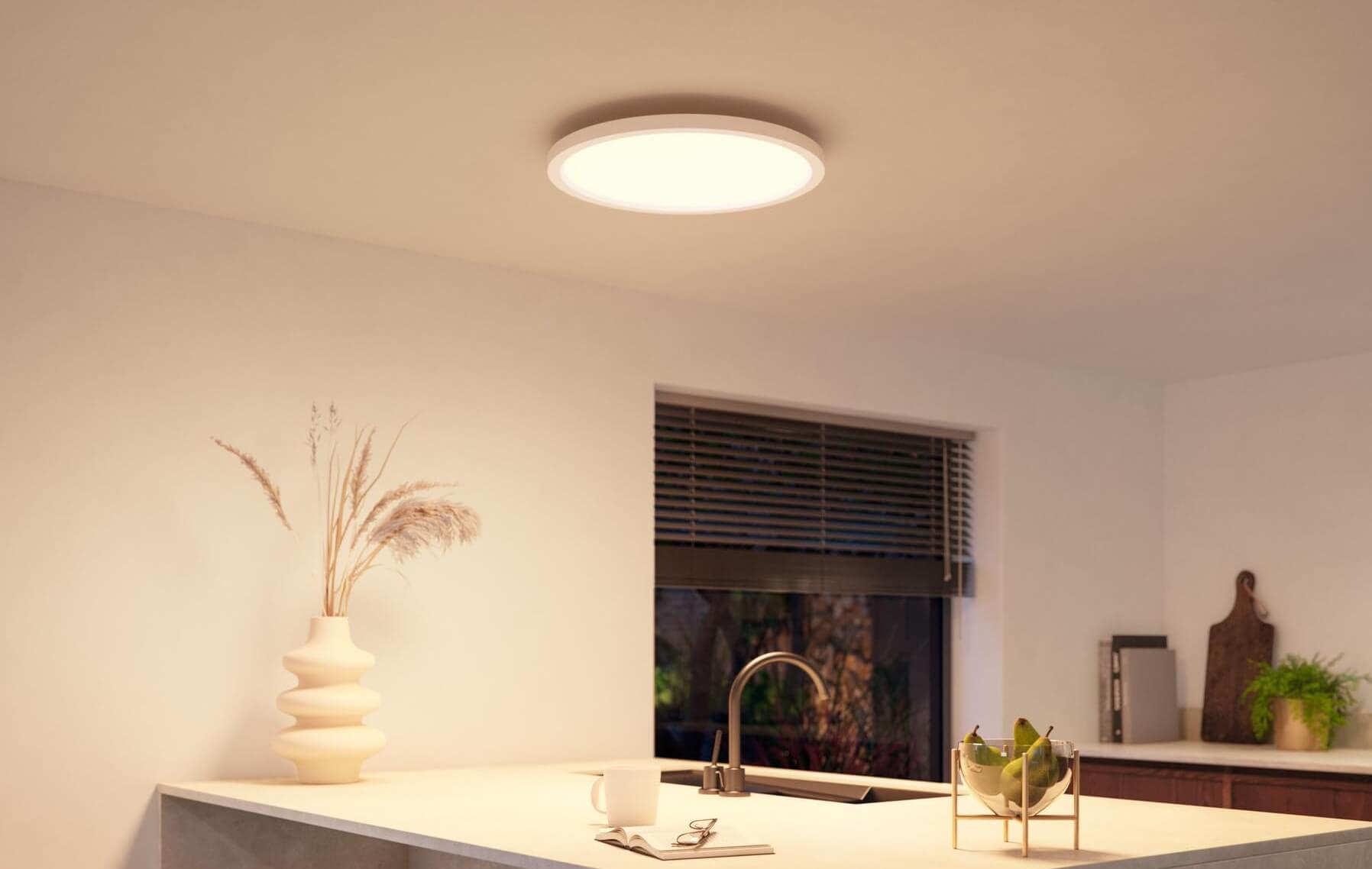 Mit rund 2.000 Lumen und deinem Durchmesser von 30 Zentimeter ist die Devote weniger für große Räume geeignet, sondern bietet sich eher für kleinere Bereiche wie das Schlafzimmer, das Gäste-WC oder die Abstellkammer an. Im Gegensatz zur günstigsten Hue Tento Deckenleuchte, kann die Devote zusätzlich noch verschiedene Farbtöne wiedergeben.