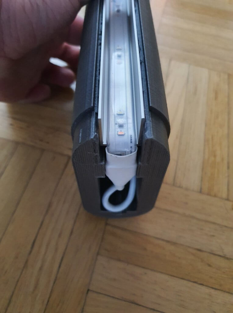 Das Alu-Profil bekommt ihr in jedem Baumarkt oder Online bei Amazon. Jörg hat hier ein U-Profil mit den Maßen 20×20x2000mm verbaut. Dort passt der 2 Meter Philips Hue Lightstrip Plus dann perfekt rein. Nachdem ihr die zwei Teile selbst gedruckt habt oder euch drucken lassen habt, müsst ihr die Bauteile nur noch zusammenfügen und den Lightstrip einsetzen.