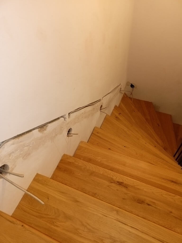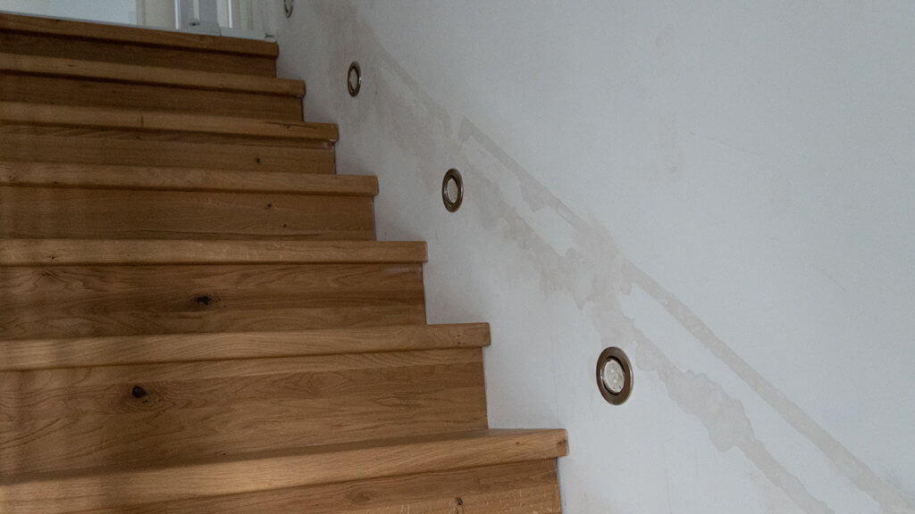 Da die Stufen von unten nach oben immer enger zusammenlaufen, entsteht dadurch eine schöne Verteilung. Wie habe ich das umgesetzt? Bei jeder zweiten Stufe habe ich mit einer 68 Millimeter Bohrkrone ein ca. 9 Zentimeter tiefes Loch gebohrt und die Zuleitung anschließend durch einen Schlitz im Putz von Loch zu Loch verlegt.