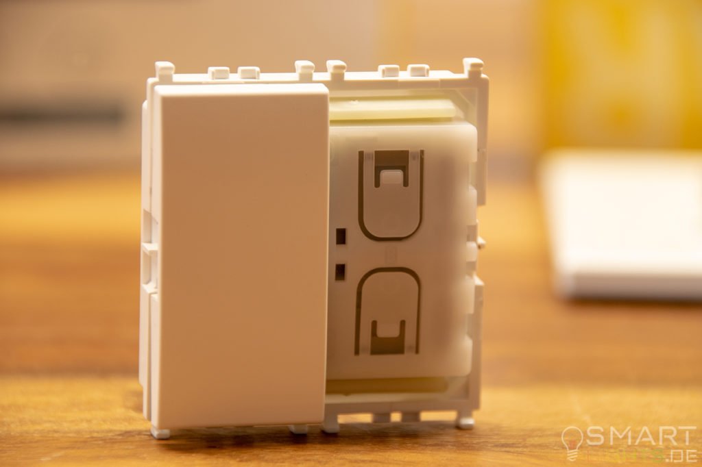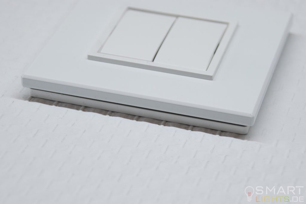 Was bei diesem Schalter bedacht werden sollte, ist der entstehende Spalt zwischen Wand und Abdeckplatte. Von Vorne fällt dieser nicht auf, aber von der Seite ist er natürlich sichtbar. Mich persönlich hat es nicht gestört und finde es zum Teil sogar besser, also eine bündige Abdeckung. Es ist halt nicht, wie bei den sonst bekannten Schaltern, sondern eine kleine Umstellung.