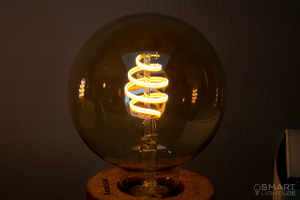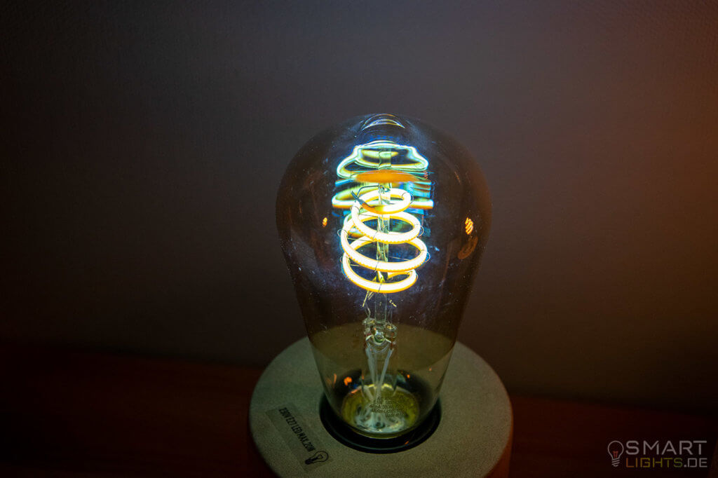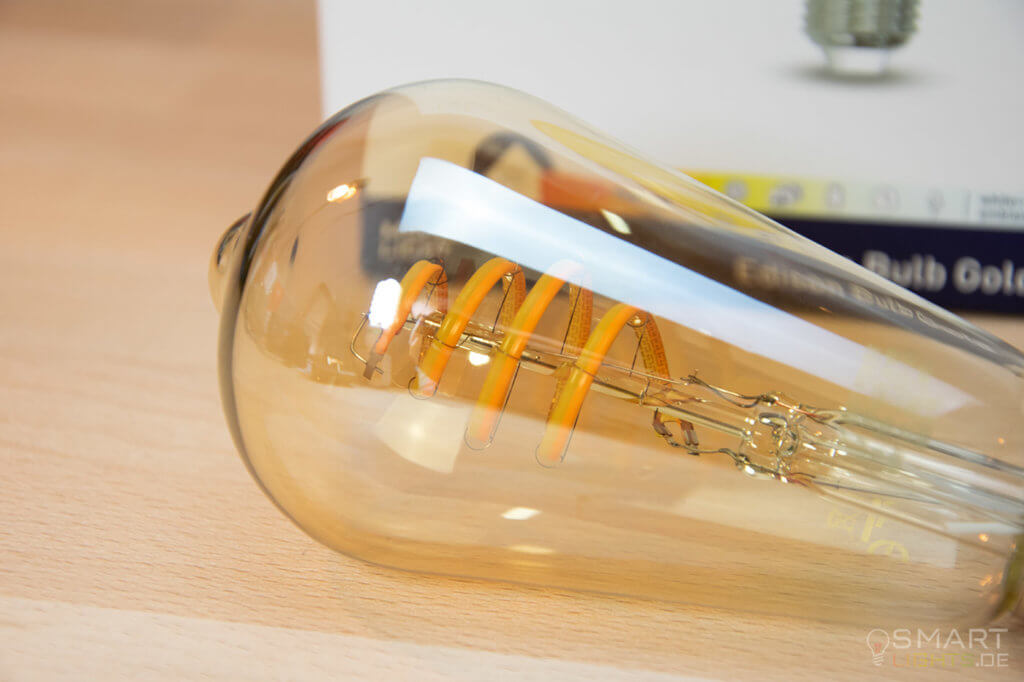 Wenn man etwas genauer hinschaut, erkennt man allerdings, das es eigentlich zwei einzelne LED-Leuchtdrähte sind, die einfach parallel und sehr eng miteinander verlaufen. Bei allen bisher erhältlichen Filament Lampen, bei denen die Farbtemperatur eingestellt werden kann, waren sie optisch immer voneinander getrennt. Ein verbauter Leuchtdraht wird für warmes Licht genutzt und einer für kühleres Licht.