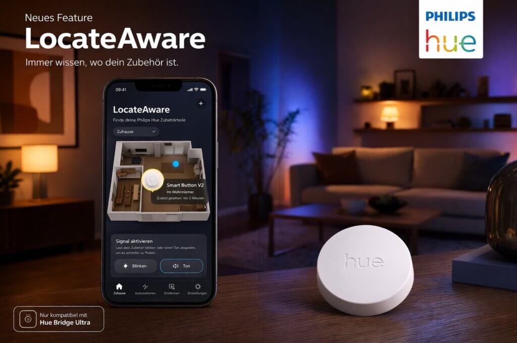 Mit LocateAware erweitert Philips Hue die bekannten „Aware“-Funktionen um ein praktisches Alltagsfeature. Die neue Hue Bridge Ultra erkennt automatisch die letzte bekannte Position von Philips Hue Zubehör wie Dimmschaltern oder Smart Buttons und stellt diese positionsgenau in der App dar. In der Praxis bedeutet das: Nutzer können jederzeit nachvollziehen, in welchem Raum sich das Zubehör zuletzt befunden hat.