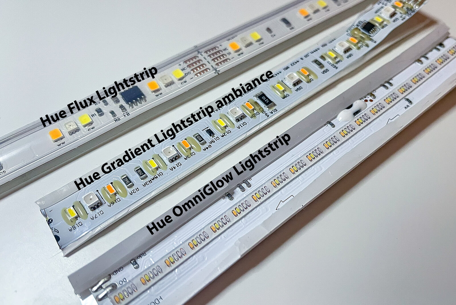 Wie oben bereits angemerkt, setzt der OmniGlow Lightstrip auf die CSP-Technologie. Das Gehäuse eines Chips wird dabei nahezu auf dessen eigentliche Größe reduziert, womit die LEDs besonders dicht aneinander platziert werden können. Das ist auch der größte Unterschied zu anderen Lightstrips wie dem Hue Ambiance Gradient, dem Lightstrip Plus V4 oder dem neuen Hue Flux Lightstrip.
