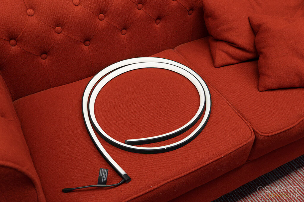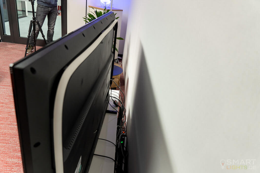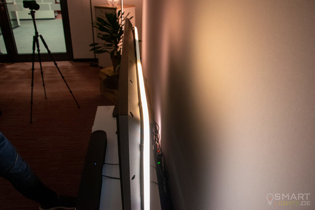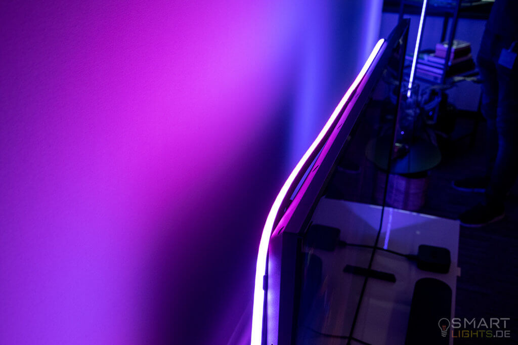 Der gesamte Leuchtstreifen wird 45 Grad gedreht an die Rückseite des Fernsehers angebaut und besteht aus einem ähnlich weichen Material, wie der Hue Outdoor Lightstrip. Er ist also flexibel, allerdings nicht wasserdicht.