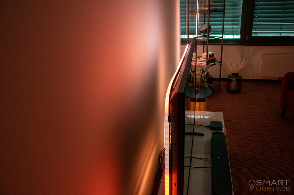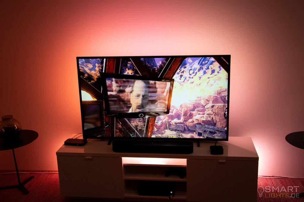 Danach sind drei Seiten vom Fernseher optimal abgedeckt und das Ergebnis kommt schon sehr nah an echtes Ambilight ran. Wo vorher mehrere Play Lightbars oder andere Hue Leuchtmittel verwendet wurden, reicht nun nur noch ein Lightstrip aus.