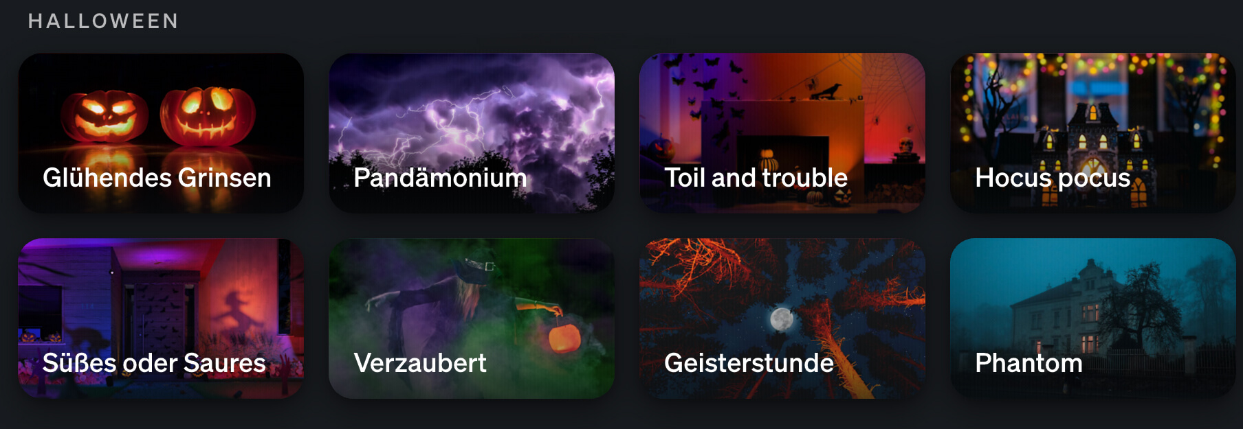 Alle Szenen sind allerdings nur rund um Halloween verfügbar und werden einige Tage danach automatisch wieder entfernt. Denkt daran, dass eure Leuchtmittel auf dem neuesten Stand sein müssen, um dynamische Szenen überhaupt starten zu können. Das prüft und aktualisiert ihr unter Einstellungen -> Softwareupdate.