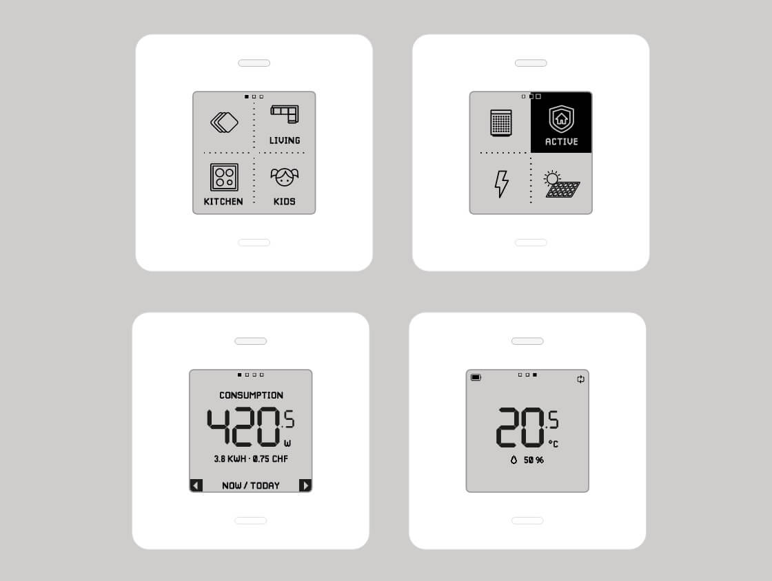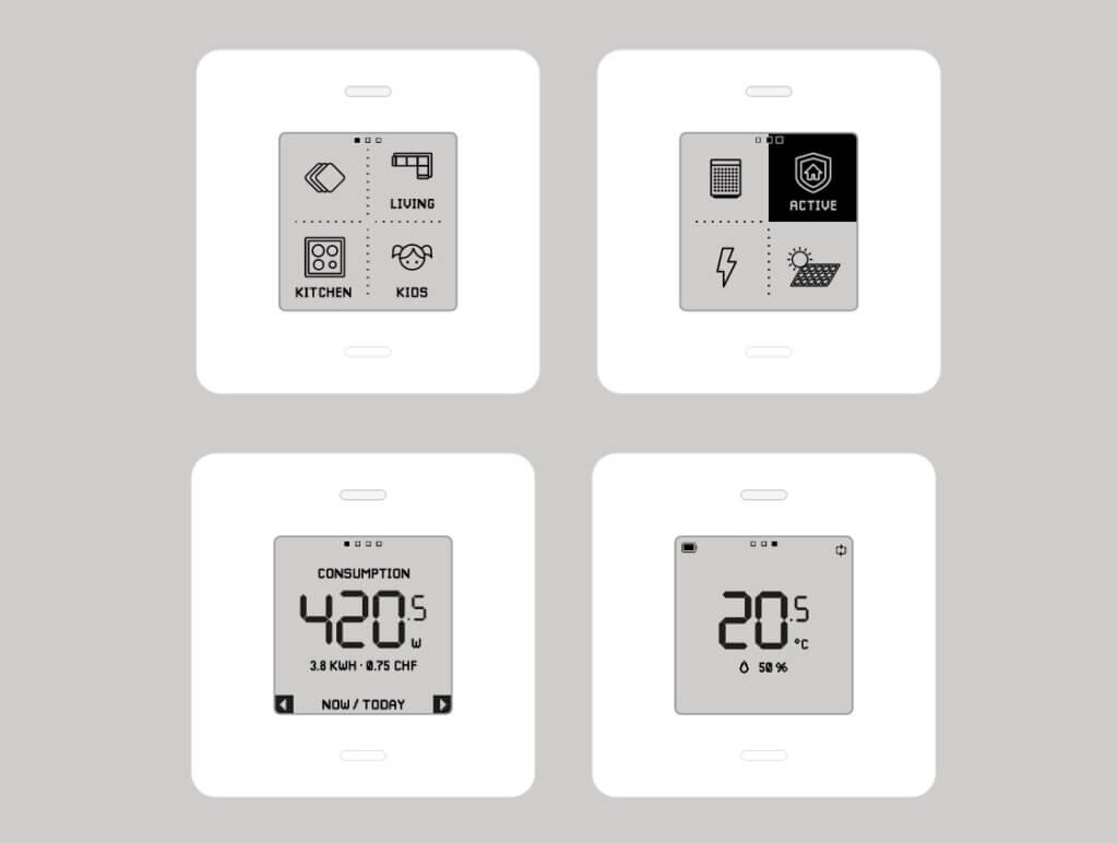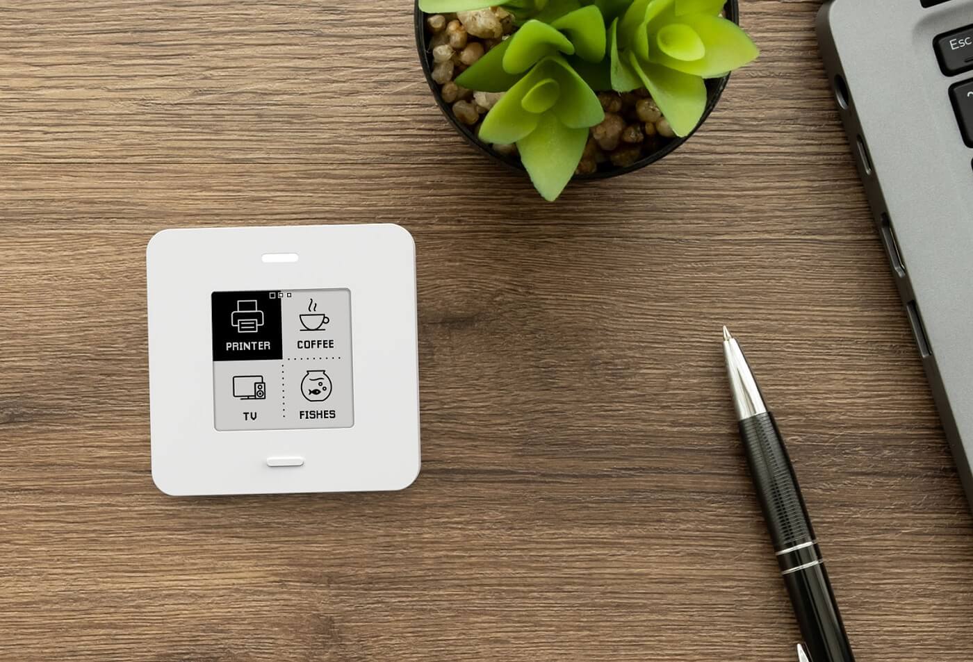 Der revolutionäre Taster ist Smart Home App und Statusanzeige in einem. Mit sparsamem E-Paper-Display und Sensoren für Temperatur und Luftfeuchtigkeit.