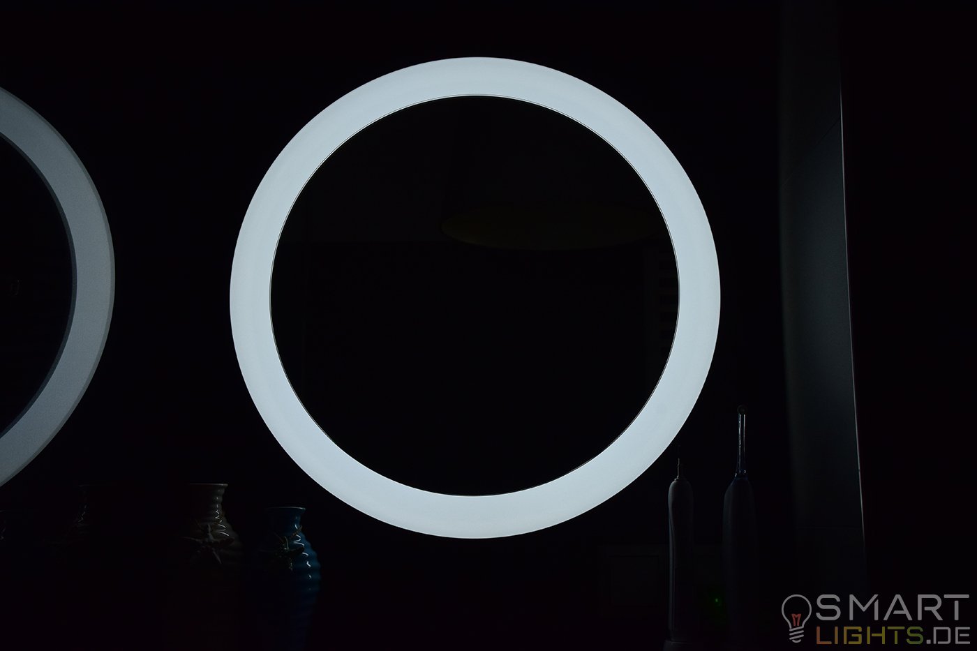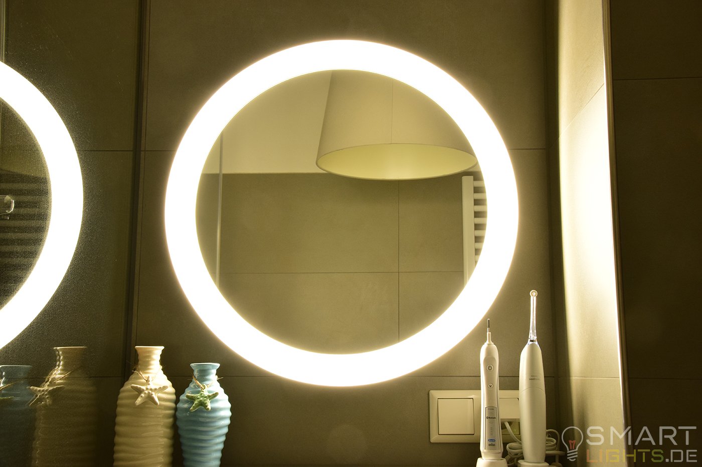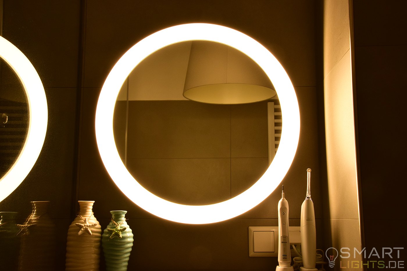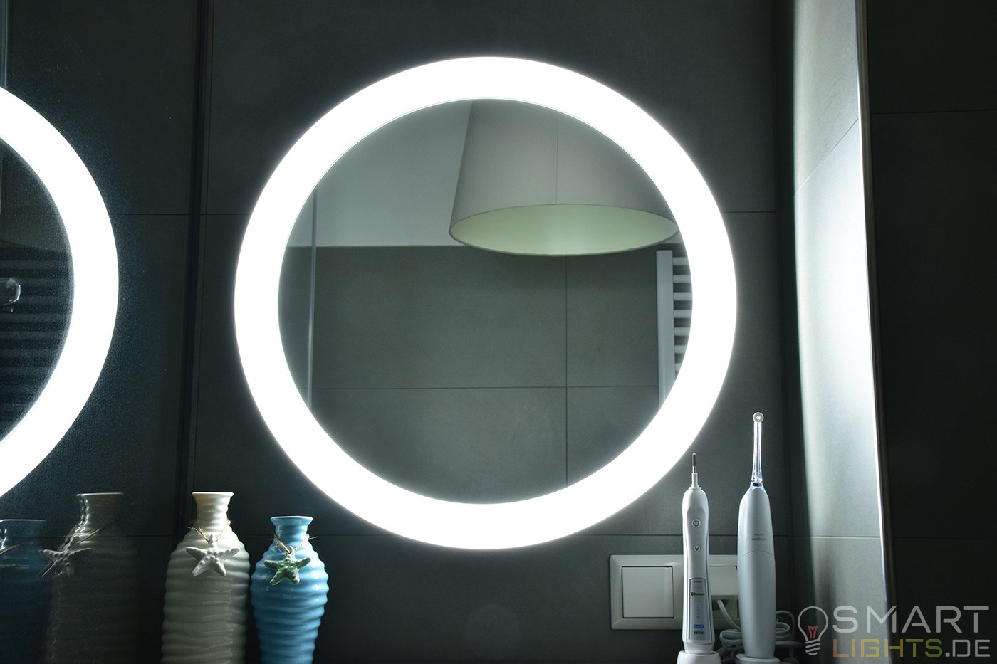 Mit einer Breite und Höhe von 56cm habt ihr genau die richtige Abmessung, damit sich der Spiegel nicht zu sehr aufdrängt und ihr dennoch genügend Spiegelfläche habt, um euch zu sehen. Dazu wird das Licht extrem weich und sehr gleichmäßig verteilt, was für viele im Badezimmer sehr wichtig ist. Für mehr Komfort kann der im Lieferumfang mitgelieferte Dimmschalter auch direkt neben dem Spiegel angebracht werden, womit sich dann die verschiedenen Lichtszenen auf Abruf einstellen lassen.