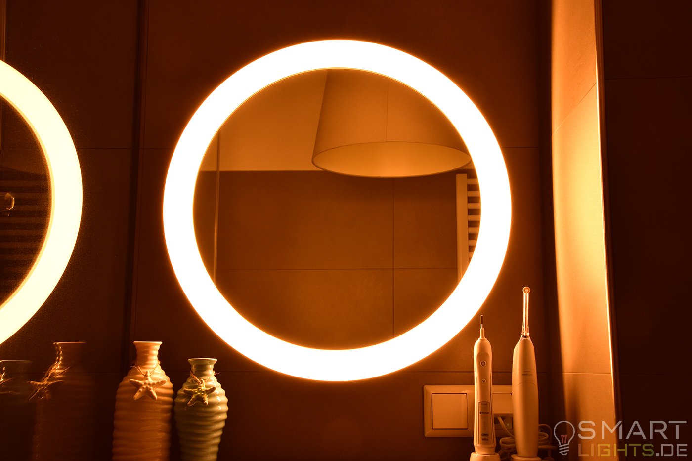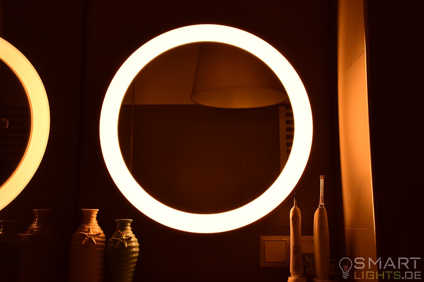 Warum habe ich mich für einen Spiegel von Philips Hue entschieden? Das ist einfach erklärt, denn dank der verschiedenen Weißtöne habe ich immer das richtige Licht. Morgens nach dem Aufstehen brauche ich etwas Energie und stelle es deshalb auf ein angenehmes hellweißes Licht ein. Am Abend ist es genau umgekehrt, dort brauche ich keinen „Wachmacher“ und stelle die Spiegelleuchte auf ein gedimmtes warmweißes Licht ein.