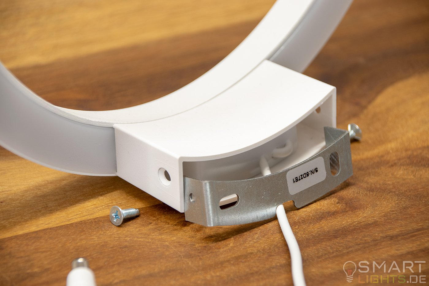 Ansonsten gibt es nicht viel zu beachten. Die Lampe ist im Durchmesser 24,3cm breit und wird ganz einfach mit einer Halterung an die Wand geschraubt. Durch die Einkerbung an der Halterung, sowie der Lampe, kann das Kabel problemlos von unten durch die Befestigungsplatte verlegt werden. Apropos Befestigungsplatte, diese wird mit zwei Schrauben an die Wand montiert und von dort kommen dann seitlich zwei Schrauben in die Lampe. Ich denke, dies sieht man auch ganz gut auf den Fotos.
