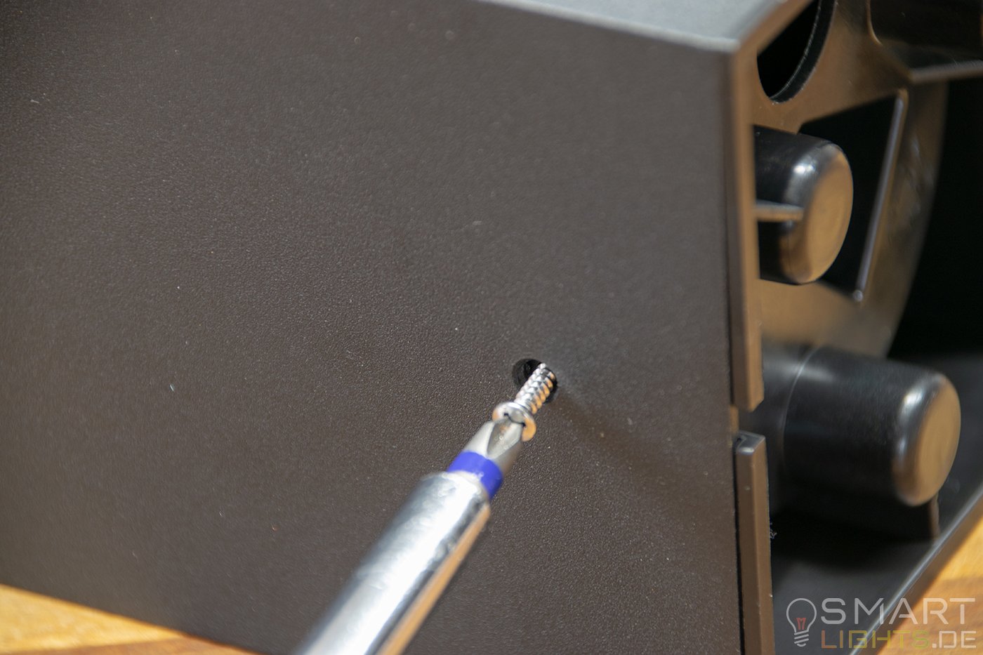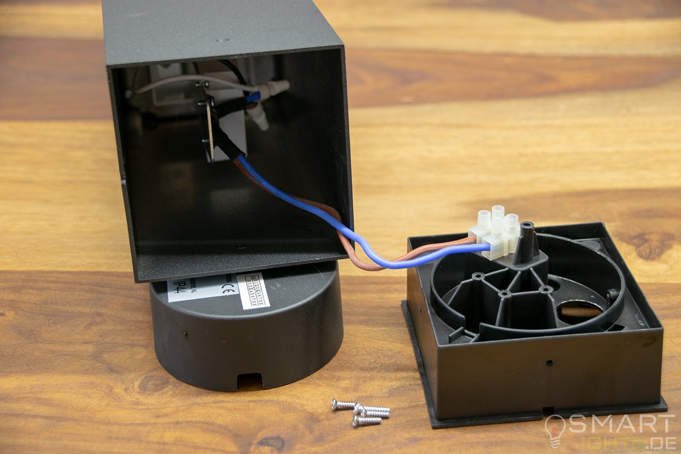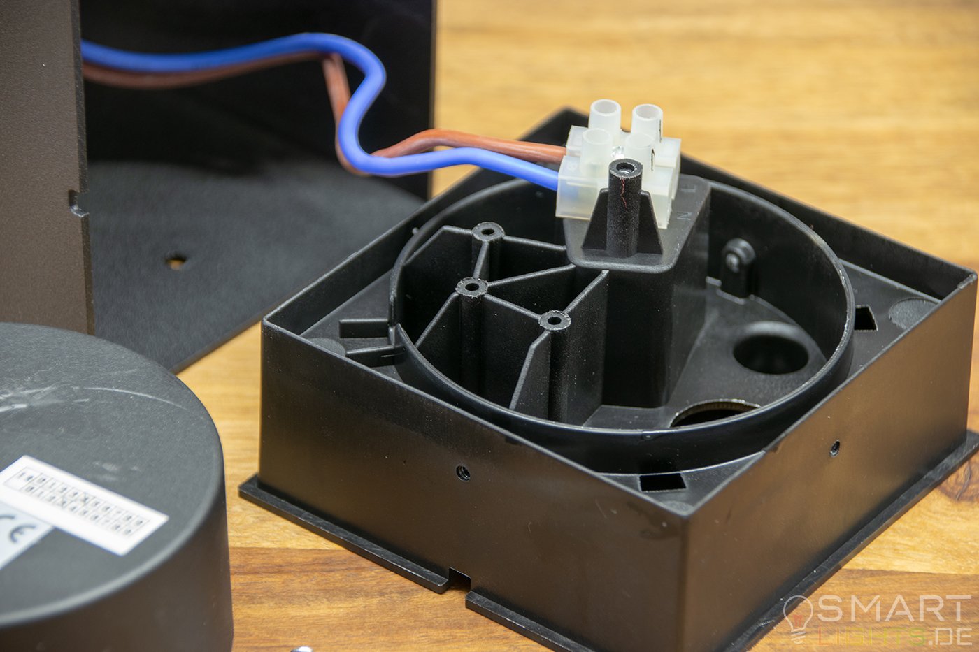 Ich habe sie zwar bisher nur im Innenbereich zum Testen angeschlossen, aber beim Begutachten waren alle Schweißnähte sauber verarbeitet und im großen und ganzen machte die Leuchte einen qualitativ sehr guten Eindruck. Die Kunststoffabdeckung im Boden in Kombination mit dem Gummipfropfen sorgt für einen Feuchtschutz (IP44 Schutzklasse), damit kein Wasser ins Innere gelangt. Hier wird die Leitung einfach von unten durchgeführt und angeschlossen.