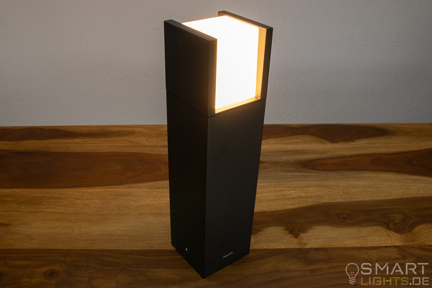 Mit dieser Sockelleuchte hat Philips zwar Gewiss keine Innovation los getreten, denn anders als die meisten anderen Outdoor Lampen, kann diese nur einen warmweißen Farbton wiedergeben, aber trotzdem sollte Sie für die meisten Anwendungen ausreichend sein.[vc_single_image image=“13622″ img_size=“full“ alignment=“right“]Mit knapp 40cm Höhe und einem quadratischen Sockel von 10cm x 10cm ist die Sockelleuchte perfekt für Einfahrten, kleine Gehwege oder den Garten konzipiert. Hier setzt Philips wieder auf das bereits integrierte Leuchtmittel, was für einige als Vorteil, aber wiederum auch als Nachtteil gesehen wird. Ich kann euch aber beruhigen, denn mit bis zu 25.000 Stunden maximaler Leuchtdauer, kann sie bei einer täglichen Einschaltzeit von 8 Stunden, mindestens 3.125 Tage leuchten.