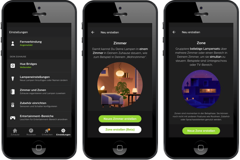 „Das neueste Upgrade der Hue-App umfasst die dauerhafte Einbindung von Zonen sowie zusätzliche Funktionen für dieses Feature. Mit diesem Upgrade können alle Zubehörkomponenten, etwa ein Philips Hue Dimmschalter, Philips Hue Smart Button oder Friends of Hue-Schalter, so konfiguriert werden, dass sie nur eine Zone statt einen ganzen Raum steuern. Beispielsweise lässt sich eine Zone für das gesamte Obergeschoss oder aber eine Ecke des Wohnzimmers einrichten und mit einem intelligenten Schalter oder Sensor steuern. Zum Upgrade gehört auch eine Ladezustandsanzeige für Zubehörkomponenten, falls die Batterie schwächer wird“.