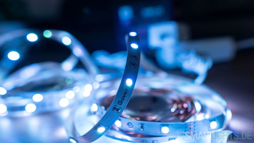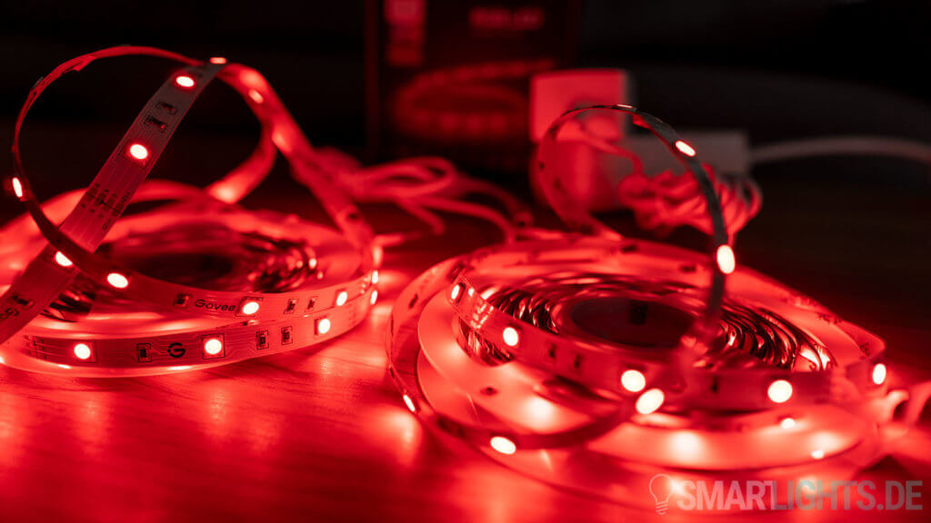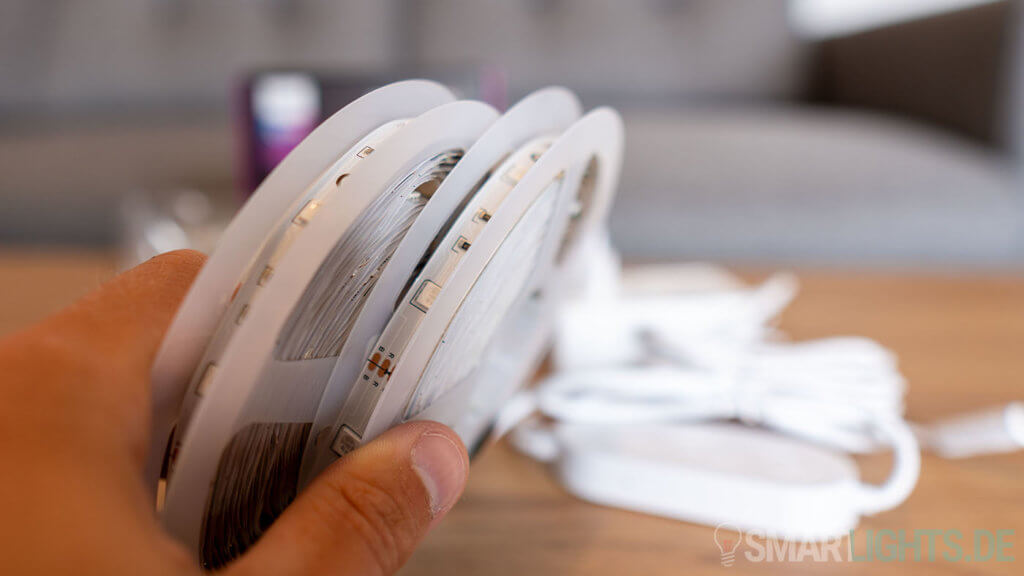 Wer den Lightstrip zum Beispiel mit einem ZigBee Lightstrip von Hue oder Innr vergleicht, wird deutliche Unterschiede feststellen. Während bei den ZigBee-Modellen noch eine Art Gummi/Silikon Überzug drüber ist, gibt es bei dem 15 Meter Govee Lightstrip nur den einfachen Lightstrip nach Hause. Dies ist kein Nachteil, da der Lightstrip in der Regel sowieso fest installiert wird, aber erwähnen wollte ich es trotzdem.